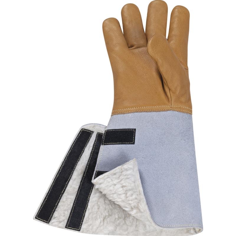 Перчатки утепленные комбинированные. Материал тыльной и ладонной частей - водоотталкивающая воловья кожа с алюминизированной полиэстеровой вставкой, устойчивой к жидкому азоту. Манжета 20 см - кожевенный спилок, ширина манжеты по всей длине регулируется с помощью контактной ленты. Внутренняя часть утеплитель – шерстяная подкладка. Перчатки имеют высокие защитные свойства от всех видов механического воздействия истирания, порезов, проколов и порезов. Устойчивость к маслу, жиру и производным углеводородов.