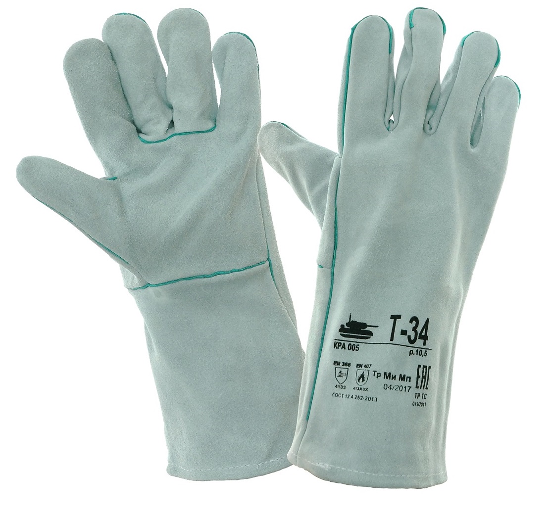 Перчатки сварщика краги Т-34 спилковые серые без подкладки предназначены для защиты рук от механического воздействия истирание, прокол, порез, искр и брызг расплавленного ме-талла и работ в условиях повышенных температур. Краги изготовлены из качественного шлифованного кожевенного спилка крупного рогатого скота сорта АВ. Швы прошиты усиленными нитками и усилены вставками из кожи зеленого цвета. Внутри краги имеется вшивной ярлык с дополнительной информацией о продукции.