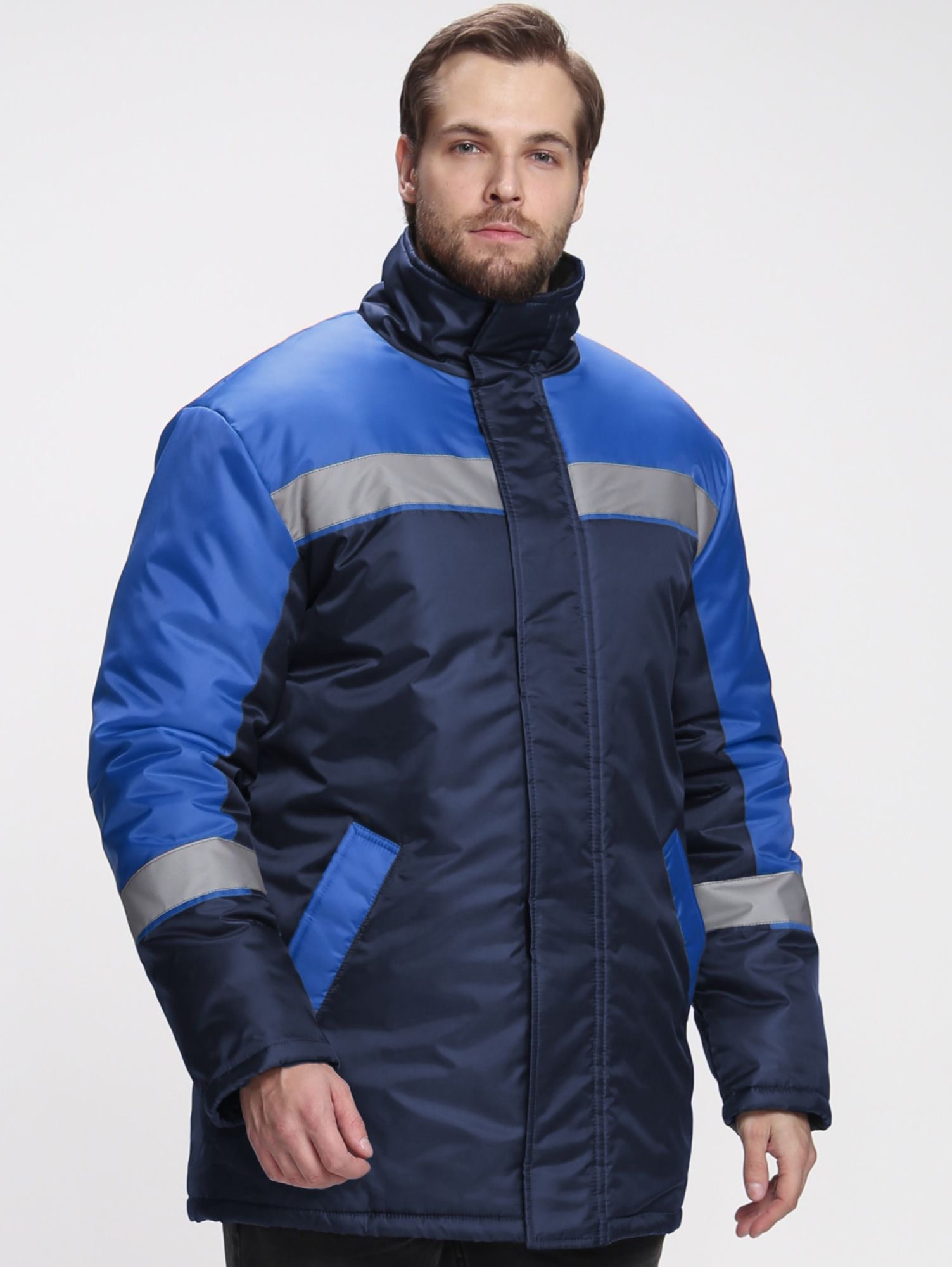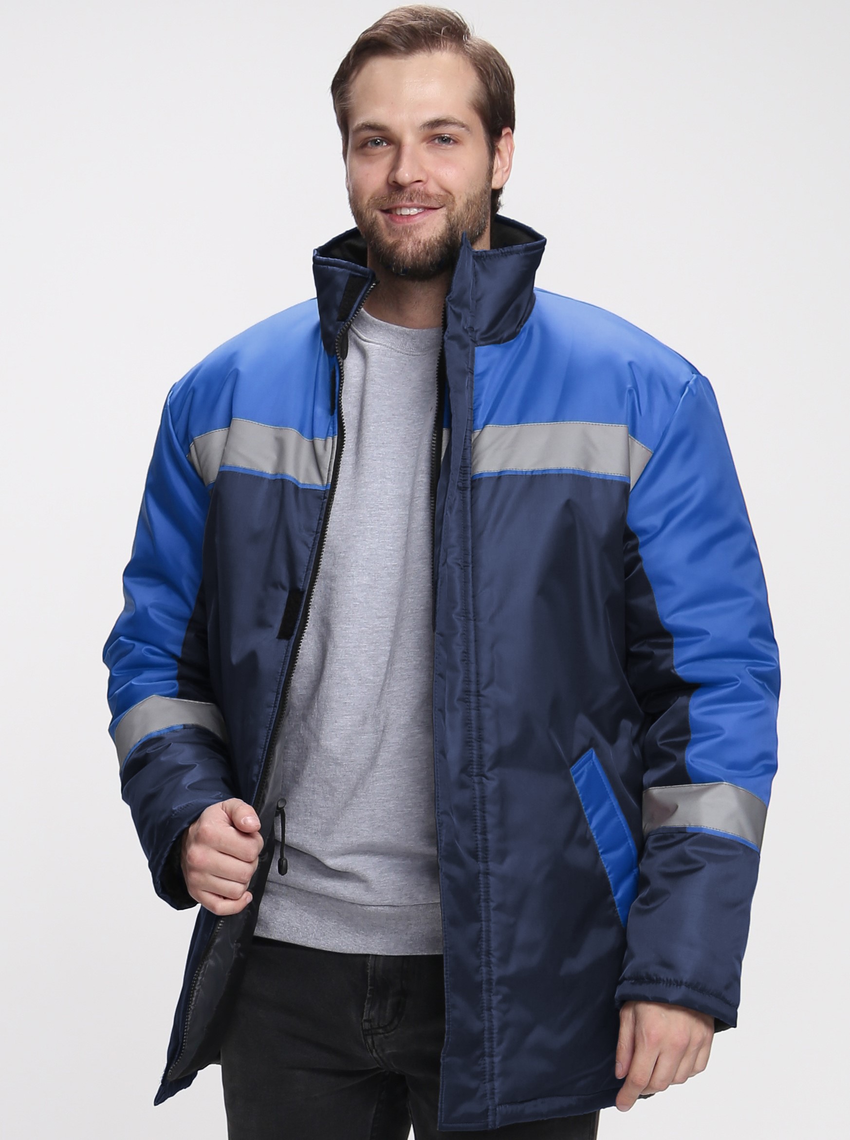 - Прямой силуэт с центральной застежкой на молнию и утепленной ветрозащитной планкой на липучке