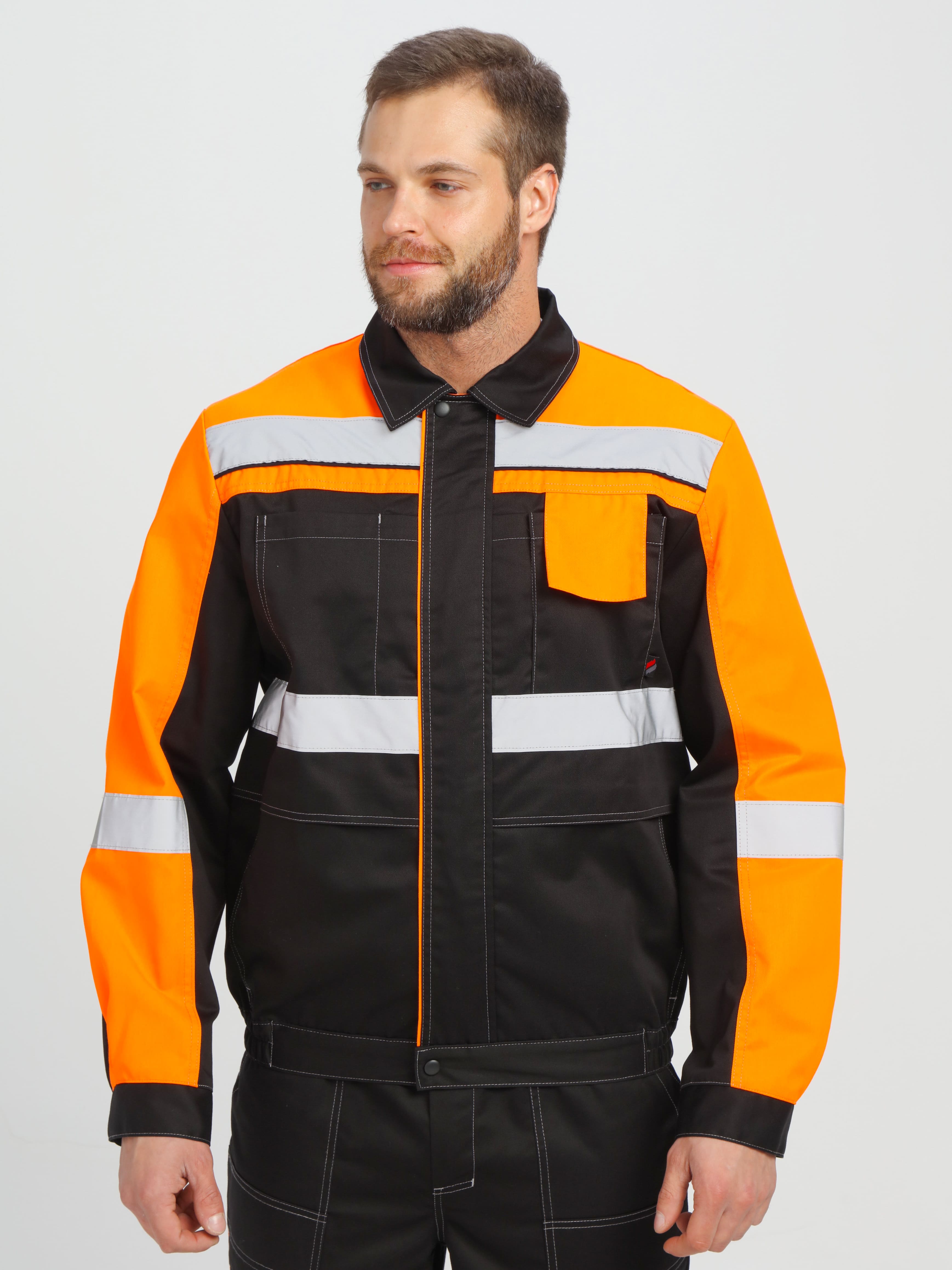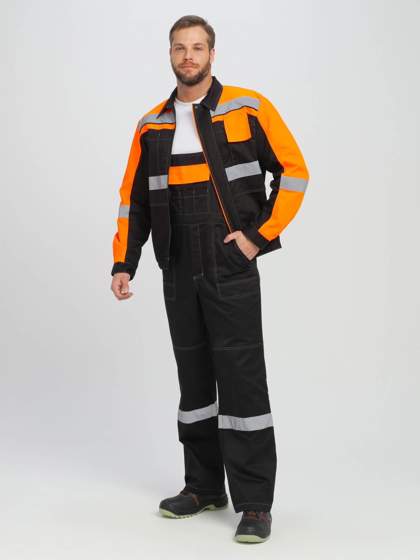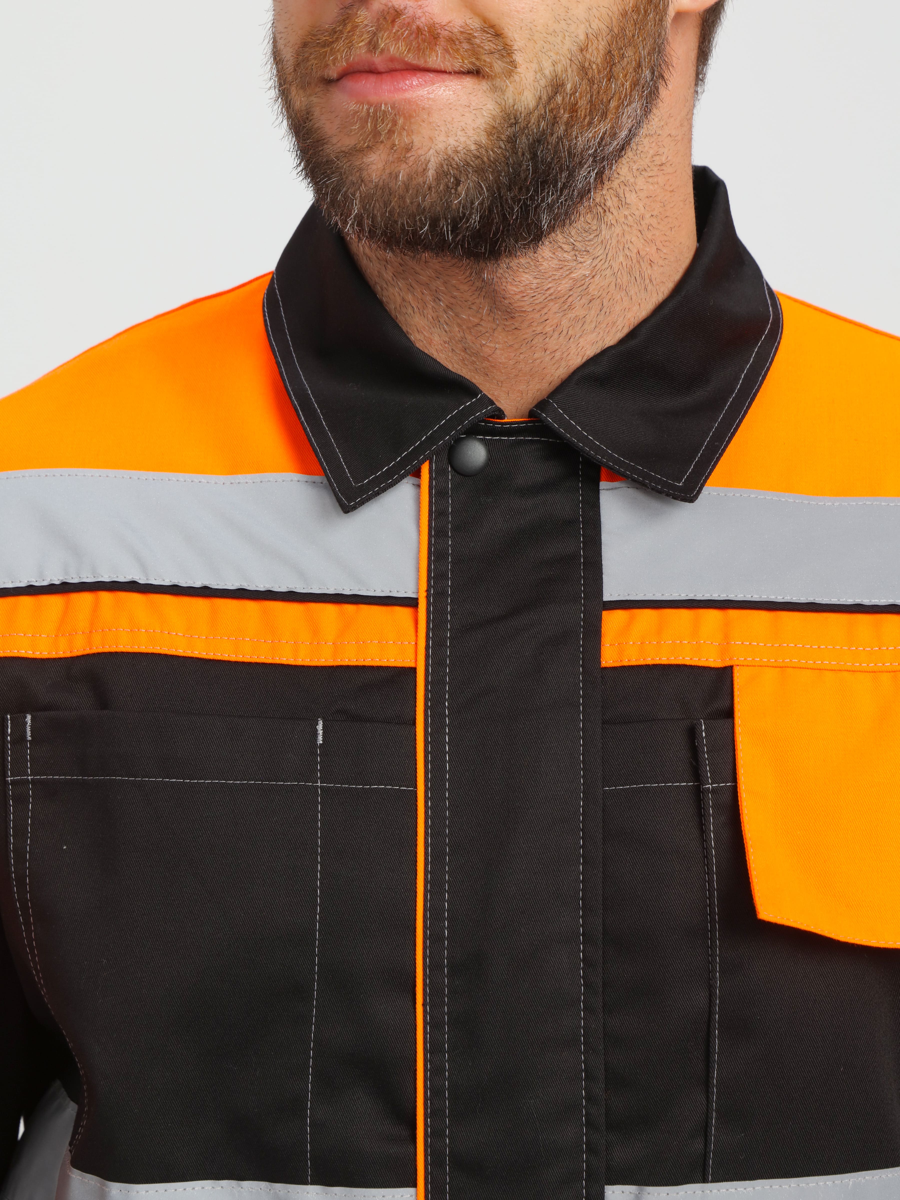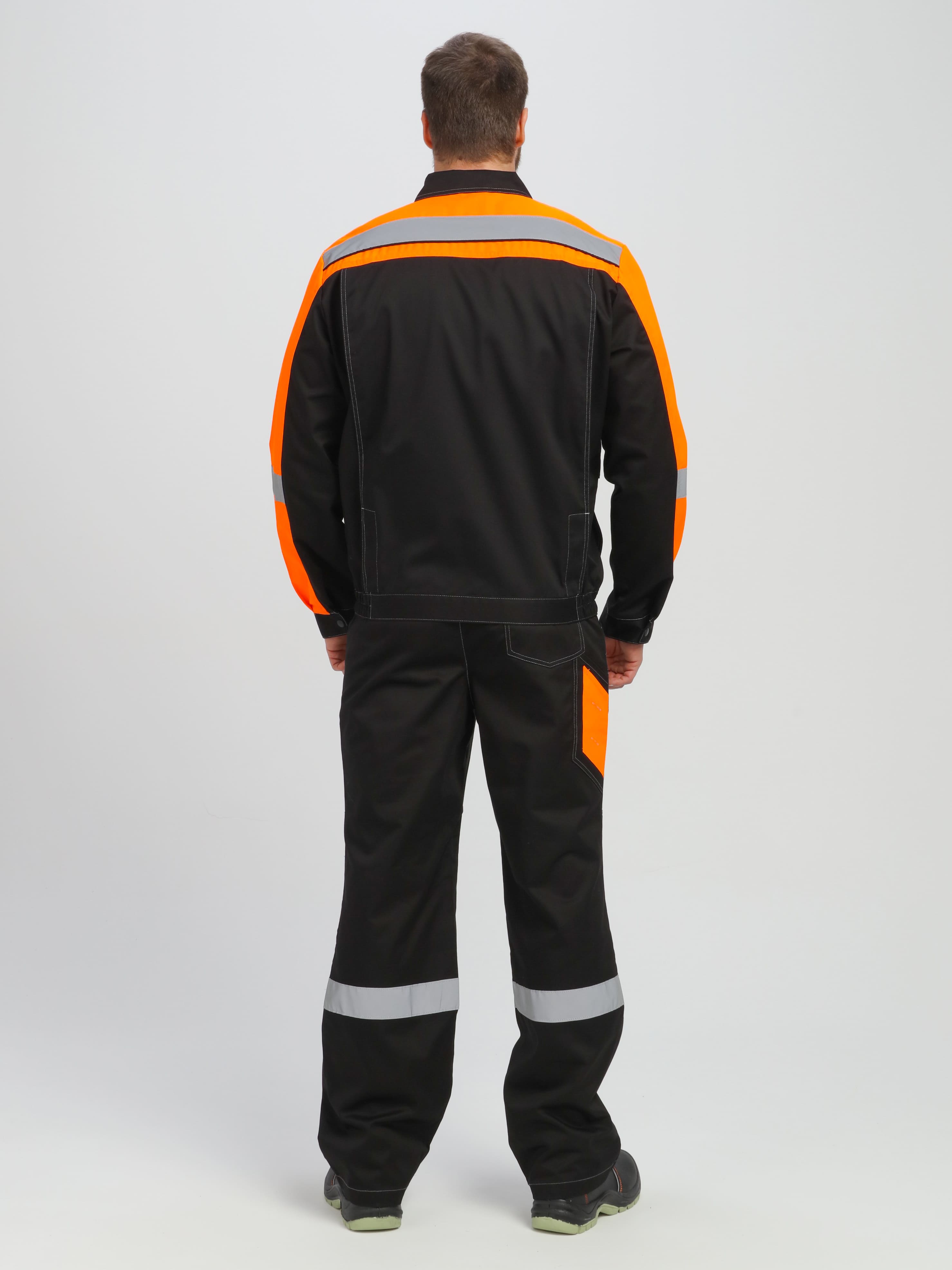 - по кокеткам, полочкам, спинке, рукавам и брючинам расположены световозвращающие полосы, что позволяет использовать костюм в условиях плохой видимости