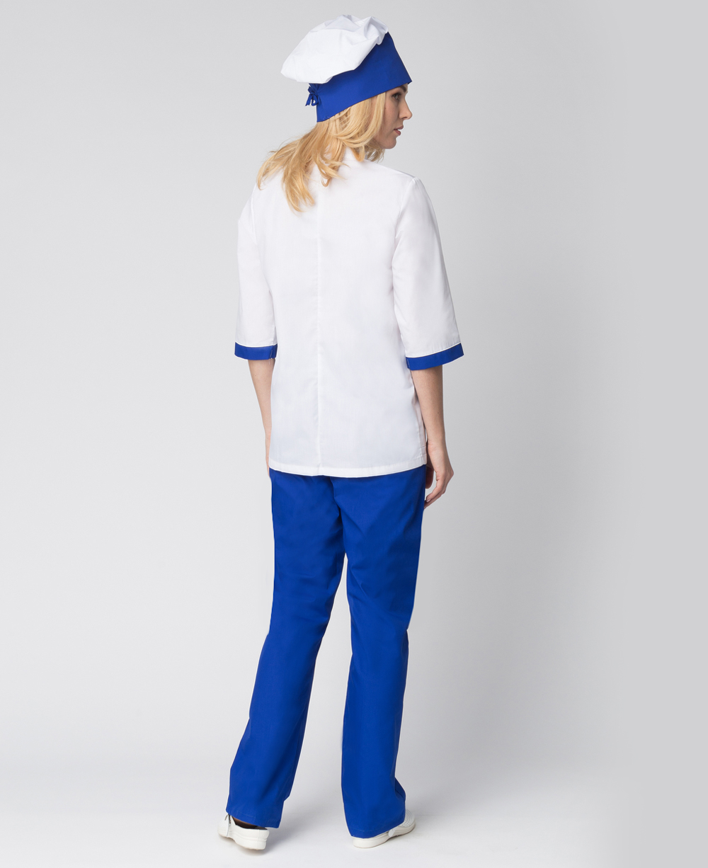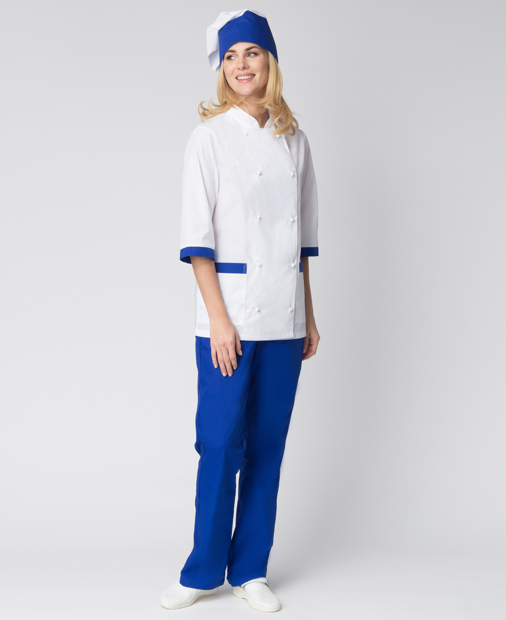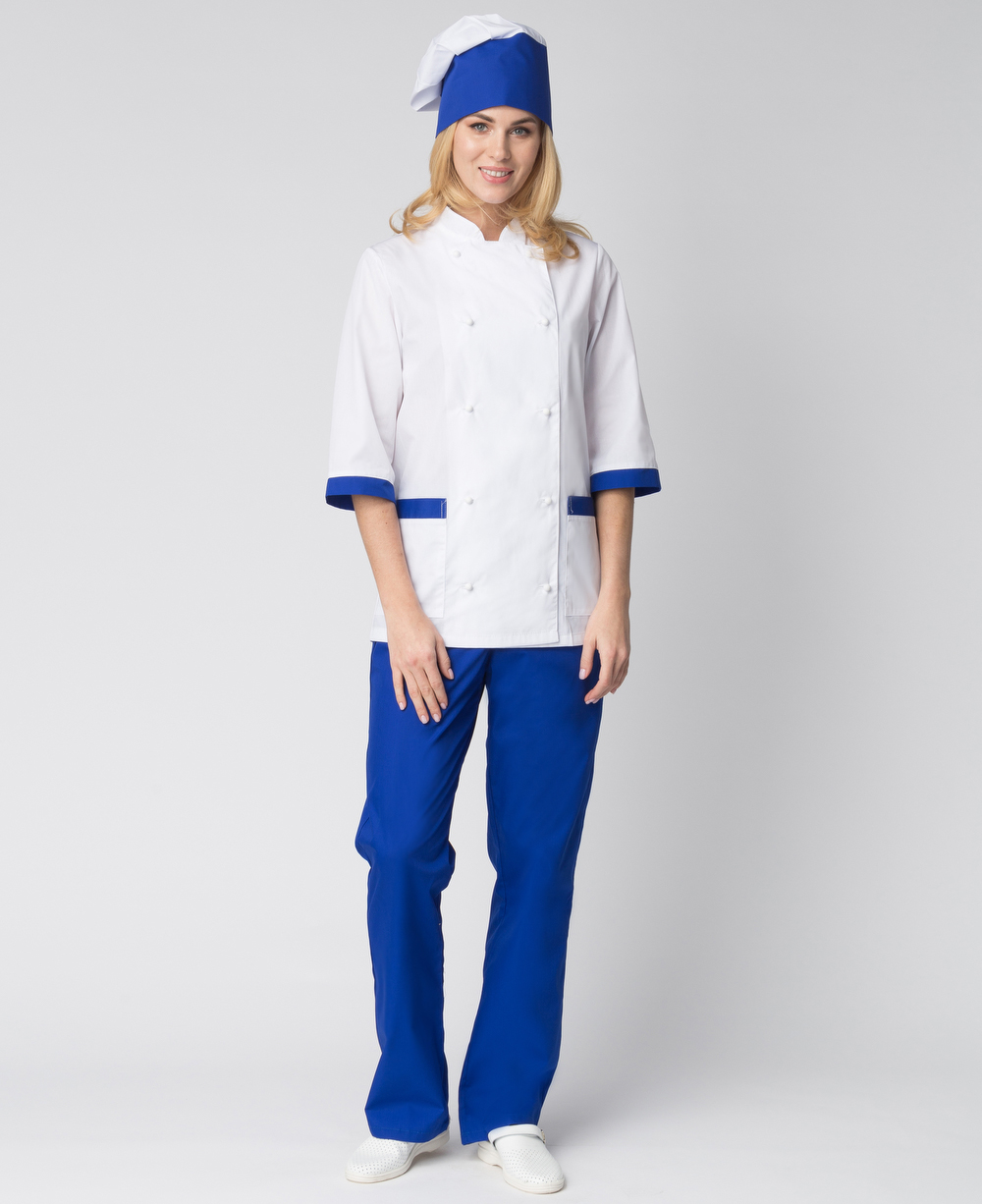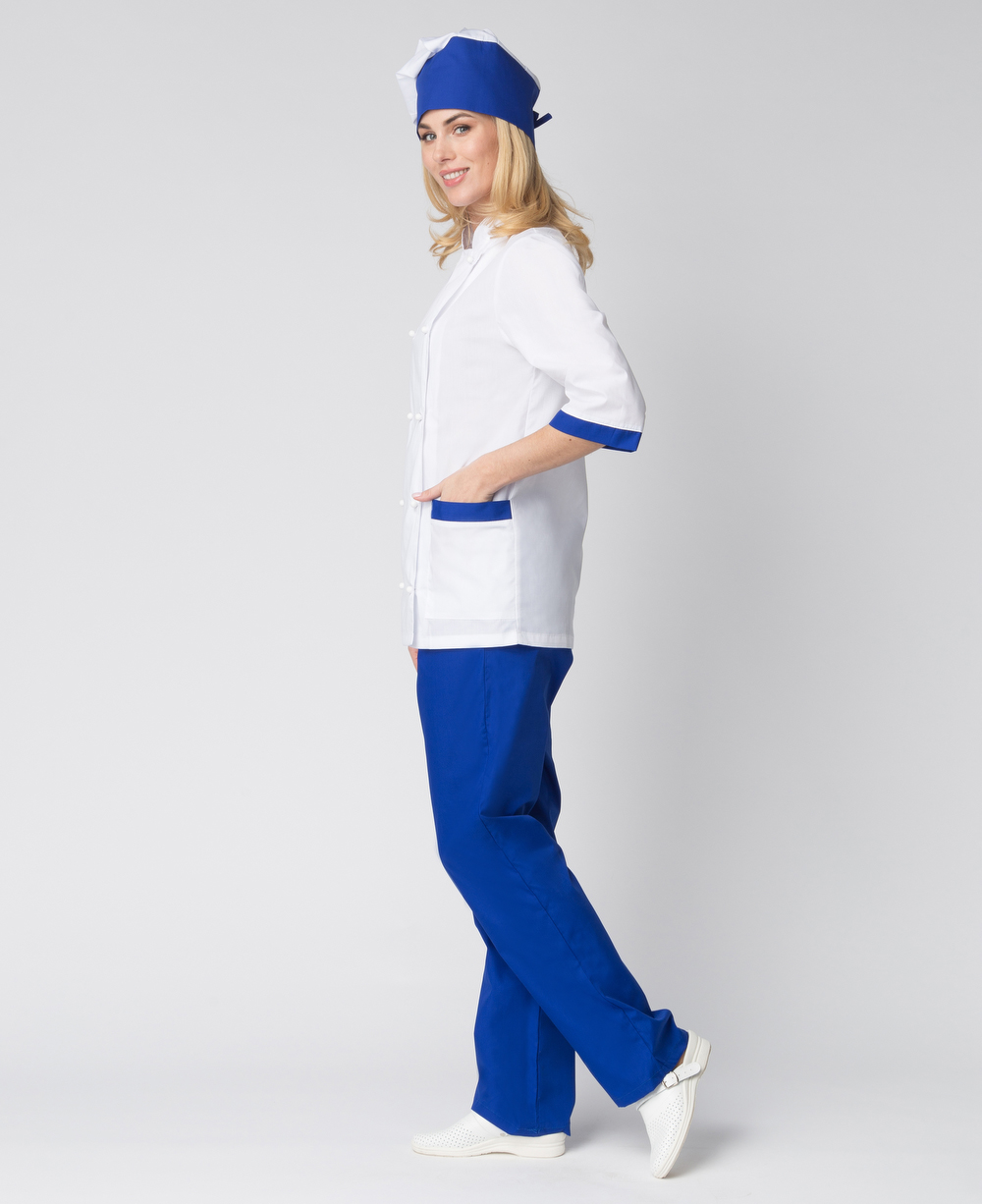 - отделка контрастной тканью синего цвета манжет и карманов