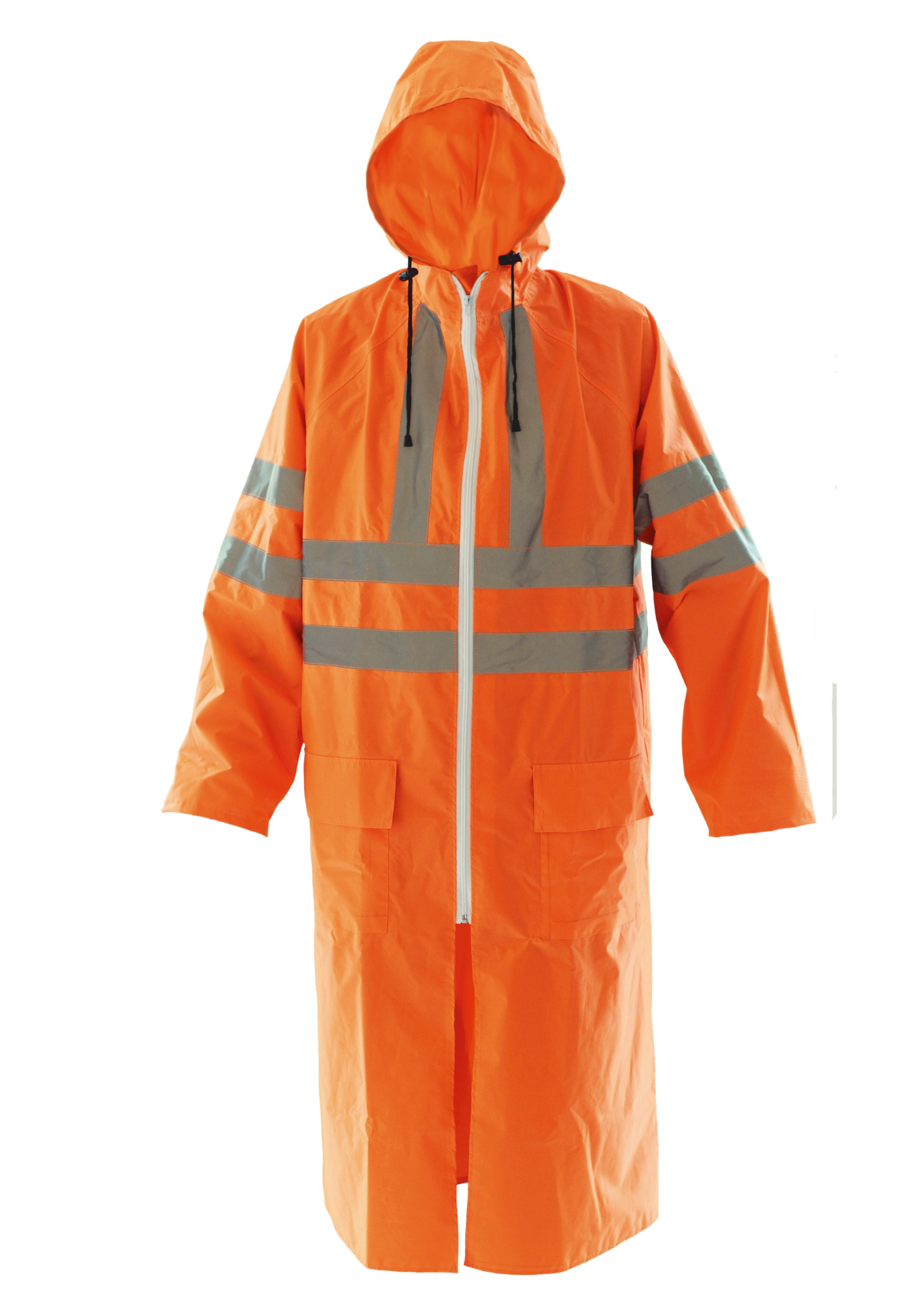Плащ для защиты от воды с застежкой на молнию с ветрозащитной планкой, имеет капюшон, накладные карманы с влагозащитными клапанами, прошитые и герметично проклеееные швы, манжеты на рукавах. Спинка с кокеткой, отверстиями для вентиляции, закрытыми клапаном. Объем капюшона регулируется по лицевому вырезу шнуром. Светоотражающие полосы шириной 50 мм.
