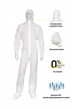 Одноразовый комбинезон изготовлен из дышащего материала полипропилена, обеспечивает хорошую паро-воздухопроницаемость, не образует ворса. Модель из нетканого материала обладает хорошими свойствами, качественная. Центральная молния закрыта планкой, эластичный капюшон с резинкой вокруг лица. Такие же резинки располагаются на талии и внизу брюк. Данная модель не сковывает движения, удобна в носке и безупречно защищает благодаря качественному материалу. Прочная и эластичная ткань устойчивая к механическим воздействиям, плотность ткани составляет 50 г/м. Комбинезон с капюшоном на застежке-молнии. Лицевой вырез капюшона, пояс, низ рукавов и брюк стянуты резинкой. Цвет: белый. ТР ТС 019/2011, EN ISO 13982-1 тип 5, EN13034 Тпи 6.